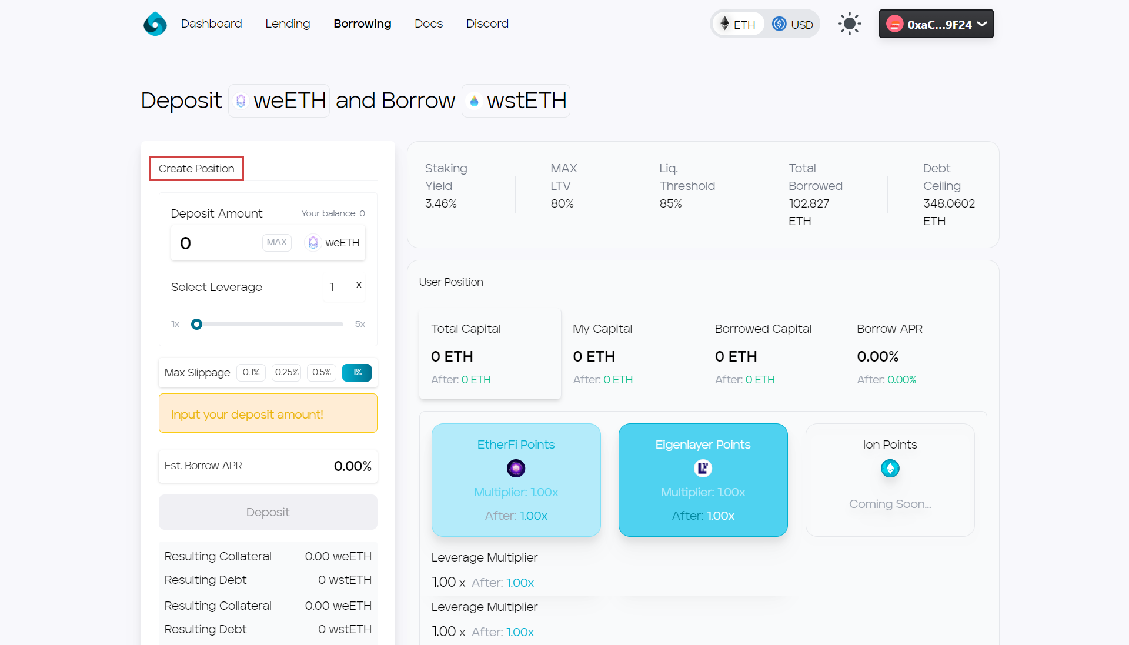 2. Move the leverage multiplier up to the desired multiple, select the max slippage, and click the deposit button